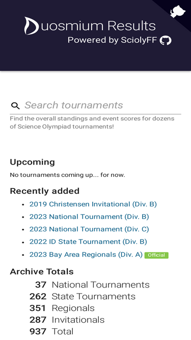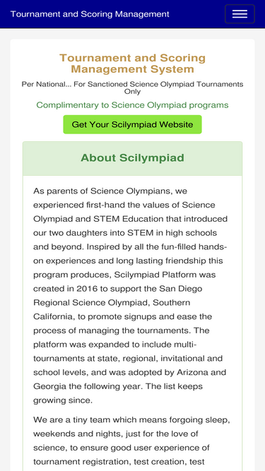 scilympiad is a tournament and scoring management system, specifically designed for science olympiad tournaments to manage registration, payment, event signup, test creation, online test taking, etc.