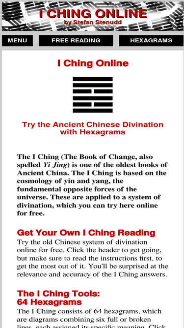 explanations and free online reading of i ching (yi jing), the book of change, with its over 3,000 years old chinese hexagrams for divination. by stefan stenudd.