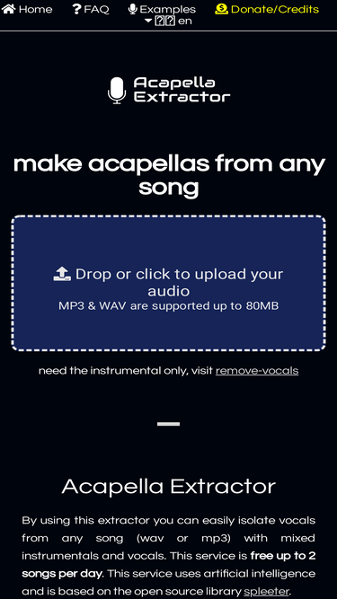 make acapella isolated vocals of any song using state of the art ai. free (2/day) & no registration.