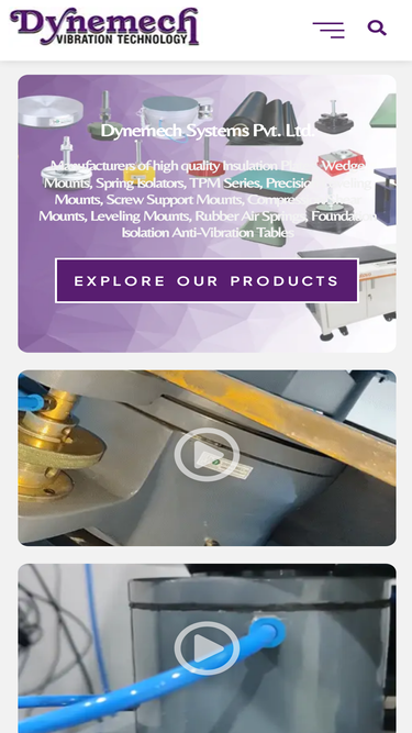 Dynemech Systems Pvt. Ltd. Manufacturers of high quality Insulation Plates, Wedge Mounts, Spring Isolators, TPM Series, Precision Leveling Mounts, Screw Support Mounts, Compression/Shear Mounts, Leveling Mounts, Rubber Air Springs, Foundation Isolation Anti-Vibration Tables Explore our products https://vibrationmountsindia.com/wp-content/uploads/video-1.mp4https://vibrationmountsindia.com/wp-content/uploads/video-2.mp4https://vibrationmountsindia.com/wp-content/uploads/video-3.mp4 Catalogues (Click to view) View More Our Products We are well-equipped with all the necessary machines and testing equipment and adhere to strict quality standards in the manufacturing processes. About Us DYNEMECH SYSTEMS Pvt. Ltd.was founded in the year 2000 with the aim of manufacturing superior quality vibration damping solutions for all modern machinery. DYNEMECH SYSTEMS Pvt. Ltd. today is one of the leading manufacturers of Anti-Vibration Mounts. We provide complete vibration damping solutions for machinery ranging from CNC machines, Power Presses, Lathe Machines, Textile Machines, Generators, Compressors, Tool Room Machines, Forging Hammers and all other kinds of heavy industrial machinery. We have established ourselves as leading manufacturers, exporters and OEM suppliers of anti vibration pads / mountings. Learn More Related Industries Sheet Metal Industry Test & Measuring Industry Textile Industry Precision Industry Forging Industry Moulding Industry Power Sector Automobiles Industry Latest Blog We are well-equipped with all the necessary machines and testing equipment and adhere to strict quality standards in the manufacturing processes. View More Client Testimonials Applications CMM Vibration Isolation CNC/VMC Machining Centers Looms, Textile & Spinning Machines Mechanical Power Presses Electronic Discharge Machine (EDM) Injection Moulding Machine Compressors High-Speed Bunching Machine Specialized Precision Levelling Applications Press Brakes Turret Punch Press Honing Machines