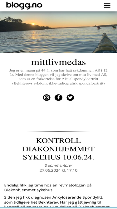 69%Jeg er en mann på 44 år som har hatt sykdommen AS i 12 år. Med denne bloggen vil jeg skrive om mitt liv med AS, som er en forkortelse for Aksial spondyloartritt (Bekhterevs sykdom, ikke-radiografisk spondyloartritt)
