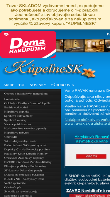 e-shop kupelnesk - kúpeľňa a rekonštrukcia bytového jadra - sanita do kúpeľne - predaj interiérové dvere, obklady a dlažby, vodovodné batérie, sprchové kúty-vaničky-žľaby, hydromasážne vane, kúpeľňový nábytok, radiátory rebríkové elektrické panelové, plávajúce podlahy - predaj cez internet s odborným poradenstvom.elektricky radiator interierove dvere masonite lacno predam umyvadlo a sprchovy kut do vane pre vodovodne baterie grohe hansgrohe s montažou na kupelnovy nabytok.podlahovy žlab apz podlaha laminátová.