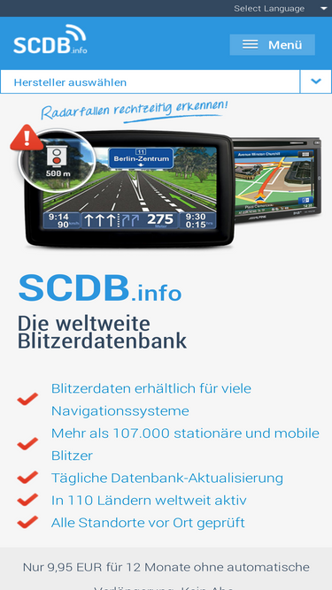 scdb ist die weltweit aktuellste blitzerdatenbank. tägliche aktualisierungen. downloads für div. marken wie mercedes, vw, garmin, nissan, igo, citroen, peugeot, alpine u.v.m.
