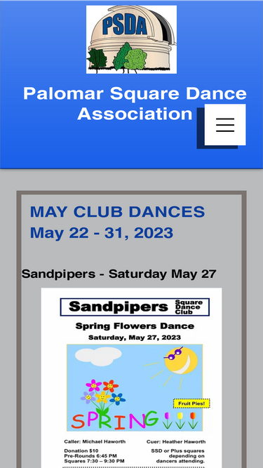 Here you can see details on the PSDA sponsored events. There are special events such as the annual Pink Ribbon Benefit Dance, 5th Saturday dances and class level dance opportunities for the betterment of square dancing. Also shown are the PSDA Board members and meeting dates.