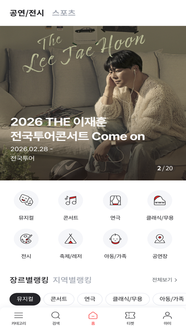 티켓예매, 스포츠, 공연, 전시 등 티켓 예매서비스 제공. 페이코(PAYCO)간편결제 지원.