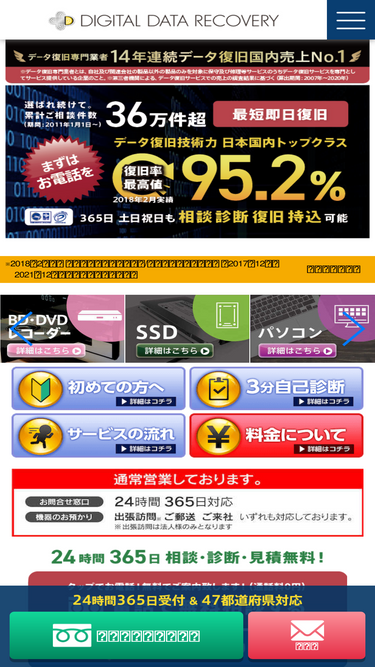 データ復旧.comは、データ復旧専門業者14年連続データ復旧国内売上No.1。365日年中無休・最短即日復旧可能。トップエンジニアによる初期診断無料!累計413,491件のご相談実績、官公庁や上場企業の実績多数!HDD(ハードディスク)、RAID、NAS、サーバーなど、幅広く対応。