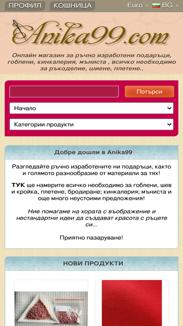 100%в магазина ще намерите : ръчно изработени подаръци - играчки, картички, игленици, ушити и комплектовани гоблени, всичко необходимо за ръкоделие, шиене, плетене, кинкалерия; конци за бродерия на dmc, anchor, ariadna, kreinik, coats и др. ; основа за бродерия на dmc, zweigart, също българска ,унгарска, немска; чешки мъниста preciosa за бродерия и изработка на бижута..