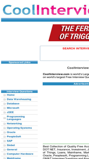 over 30,000 interview questions in different categories - technical, hr, management, accounting, finance.java, c, c++, asp .net, dot net j2ee, xml, etc. interview questions. visit now!