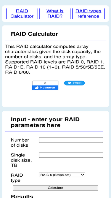 online raid calculator to assist raid planning. calculates capacity, speed and fault tolerance characteristics for a raid0, raid1, raid5, raid6, and raid10 setups.