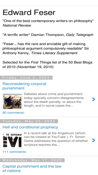 "One of the best contemporary writers on philosophy" National Review "A terrific writer" Damian Thompson, Daily Telegraph "Feser... has the rare and enviable gift of making philosophical argument compulsively readable" Sir Anthony Kenny, Times Literary Supplement Selected for the First Things list of the 50 Best Blogs of 2010 (November 19, 2010)