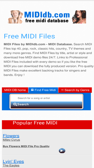 explore a vast collection of free midi files on mididb.com - the ultimate midi database. discover midi files spanning various genres including top 40, pop, rock, classic hits, country, and tv themes. download free midi demo files 24/7, and access links to professional midi files for enhanced versions. perfect for singers and bands, these high-quality midi files serve as exceptional backing tracks. enjoy unlimited downloads!