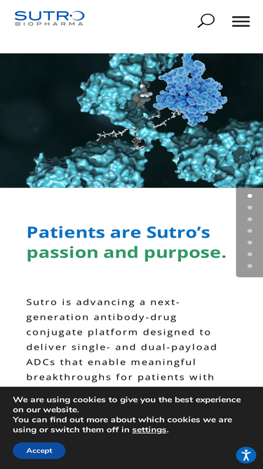 100%sutro biopharma, inc. is a public biotechnology company headquartered in south san francisco, california focused on clinical stage drug discovery, development and manufacturing company. using its integrated cell-free protein synthesis platform, xpresscf, to create a variety of protein therapeutics for cancer and autoimmune disorders. it focuses to design therapeutics using potent modalities, including cytokine based immune-oncology (i/o) therapeutics, antibody-drug conjugates (adcs) and bispecific antibodies that are directed primarily against clinically validated targets. its product candidates include stro-001 and stro-002. stro-001 is an adc directed against the cancer target cd74, for patients with multiple myeloma and non-hodgkin lymphoma (nhl). stro-002 is an adc directed against folate receptor-alpha (folra), for patients with ovarian and endometrial cancers. stro-001 and stro-002 are designed and optimized for therapeutic index by placing linker-warheads at specific locations within the antibody using its xpresscf platform.