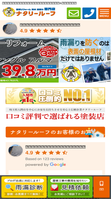 入間市・狭山市地域密着の屋根リフォーム・雨漏り専門店ナタリールーフ。年間90棟以上の実績と経験で住まいの屋根を守ります!ショールーム来店・相談・診断無料