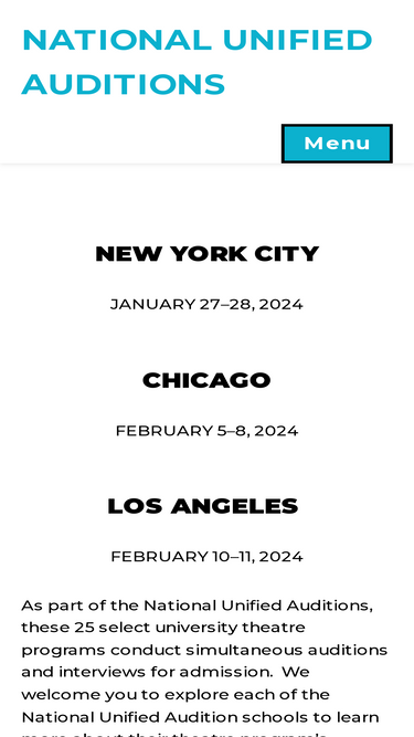 National Unified Auditions is a collection of 26 Universities and Colleges that conduct auditions for incoming students to their theatre programs.