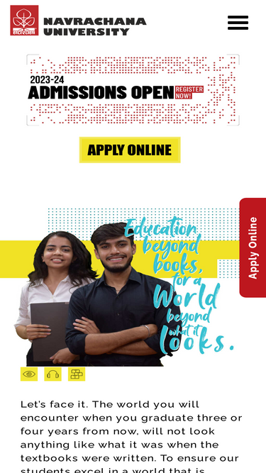 Admissions open for Navrachana University’s Undergraduate, Postgraduate, PhD and Professional programs for the Academic Year 2026-2027. Apply Now. Ranked as top private university in Vadodara, Gujarat