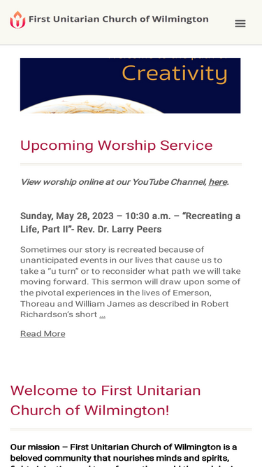 98%Welcome to First Unitarian Church of Wilmington! Our mission – First Unitarian Church of Wilmington is a beloved community that nourishes minds and spirits, fights injustice, and transforms the world through loving action. Welcome – we’d love to have you join us! Worship Sunday mornings 10:3