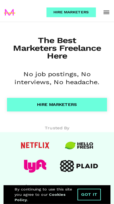 88%MarketerHire allows startups, businesses, and Fortune 500 companies to hire top marketing talent in less than a week. Every hire comes with a two-week trial to ensure a perfect fit.