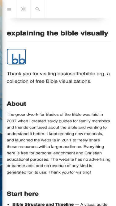 A visual guide that illustrates the structure of the Bible, arranged chronologically. Provides a better understanding of when the events described in the Bible occurred in history. Available in over a dozen languages.
