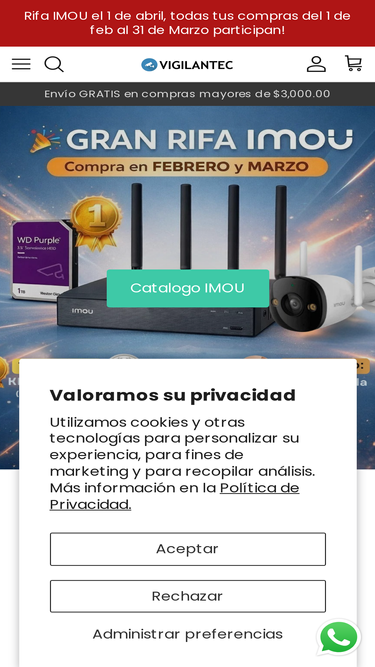 79%¿Qué incluye este kit? 4 Cámara bullet IP POE micrófono IP67 2MP 1080P Analog Killer 2.8mm Metal+Policarbonato Tiandy - TC-C321N SPEC:I3/E/Y/2.8MM 1 NVR NVR Tiandy 4 Canales H.265 1HDD 4CH PSE - POE - ONVIF Modelo: TC-R3104 SPEC:I/B/P4/C/AM/L/S/V2.0 4 Cable ethernet 20m LAN CAT5E armado - VGL-ET-I-20M 1 Disco duro de 1tb SATA de 3.5" especial para cctv (wd purple / skyhawk) CARACTERÍSTICAS CLAVE CÁMARA Carcasa de metal+plástico Hasta 1920×1080@30fps S+265/H.265/H.264 Mín. Color de iluminación: 0.04Lux@F2.2 IR inteligente, alcance de infrarrojos: 30 m Micrófono incorporado Condiciones de funcionamiento -30°~60°, 0~95% HR POE, IP67 Admite detección de movimiento Cámara Sensor de imagen: 1/2.9"CMOSMín. Iluminación: Color:0.02Lux@ (F2.0, AGC activado), B/W:0Lux con IRTiempo de obturación: 1s~1/100000sDía y noche: Filtro de corte IR con interruptorWDR: Magnético (ICR) DWDRAjuste de ángulo: 0~360°(P); 0~80°(T); 0~360°(R) Lente Tipo de lente Lente focal fijaLongitud focal 2,8 mmMontura del lente M12Rango de apertura F2.0Campo de visión 102.8°(H); 57.6°(V); 117.8°(D)Distancia de DORIDetectar: 41,48 mObservar: 16,46 mReconocer: 8,3 mIdentificar: 4,1 m Iluminación LED infrarrojos 2Distancia de infrarrojos 30mLongitud de onda 850nm Estándar de compresión Compresión de video: S+265/H.265/H.264B/H.264M/H.264HBitrate de vídeo 32k~4MbpsCompresión de audio: G.711A/G.711UFrecuencia de muestreo de audio 8kHz Imagen Máx. Resolución1920×1080@30fpsTransmisión principal PAL:25fps (1920×1080, 1280×720, 704×576, 640×480)NTSC:30fps (1920×1080, 1280×720, 704×480, 640×480)Sub corriente PAL:25fps (704×576, 704×288, 352×288, 640×360)NTSC:30fps (704×480, 704×240, 352×240, 640×360) BLC: SíCHL: SíAGC: Sí3D DNR Sí Balance de blancosAutomático/Semiautomático/Manual/Sol/Luz natural/Lámpara de luz cálida/Lámpara de luz diurna/Filamento Lámpara/Bloqueo Balance de blancosOSD Superposición de caracteres adicionales en 1 región, 1 línea, con un máximo de 48 caracteres o 16 caracteres ch